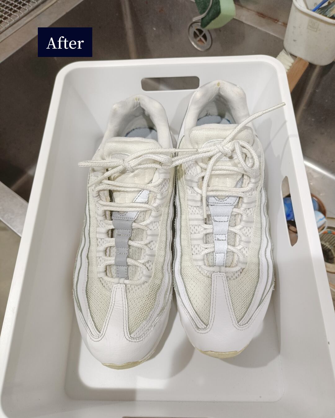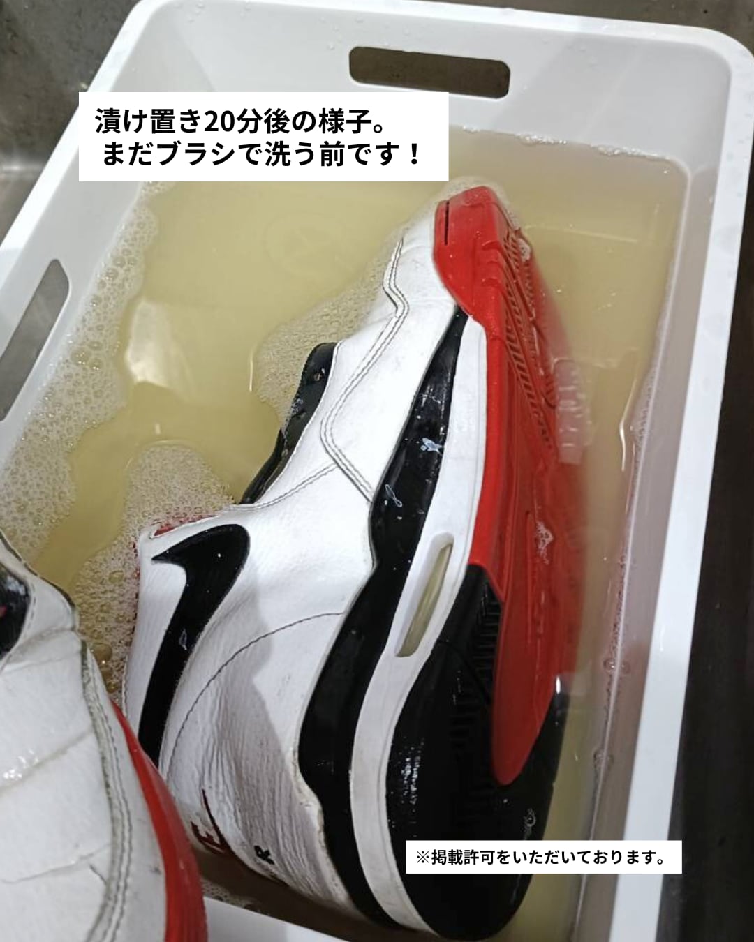 40〜50℃のお湯に溶かして、靴を10分ほどつけ置くだけで、擦らなくても奥の汚れが浮き上がり、驚くほどスッキリ仕上がります。